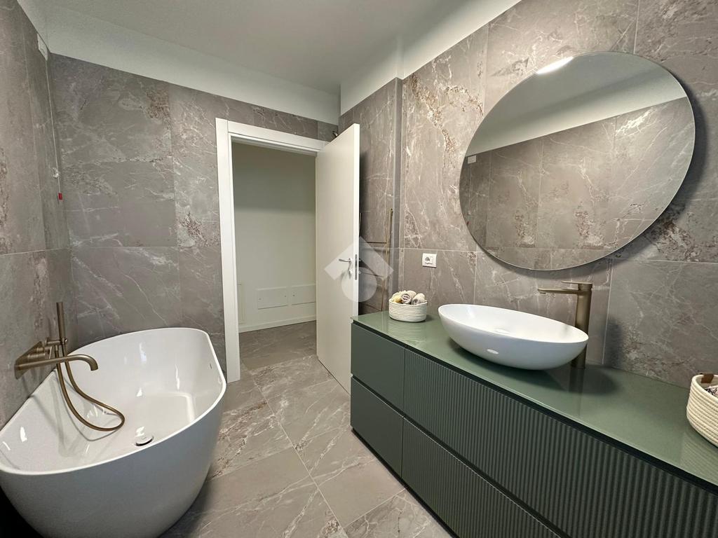 Il disimpegno conduce alla zona notte suddivisa in camera matrimoniale con cabina armadio specchiata, bagno padronale con sanitari sospesi e vasca a libera installazione, seconda camera anch'essa con affaccio sull'esterno e secondo bagno con box doccia e colonna lavatrice/asciugatrice.