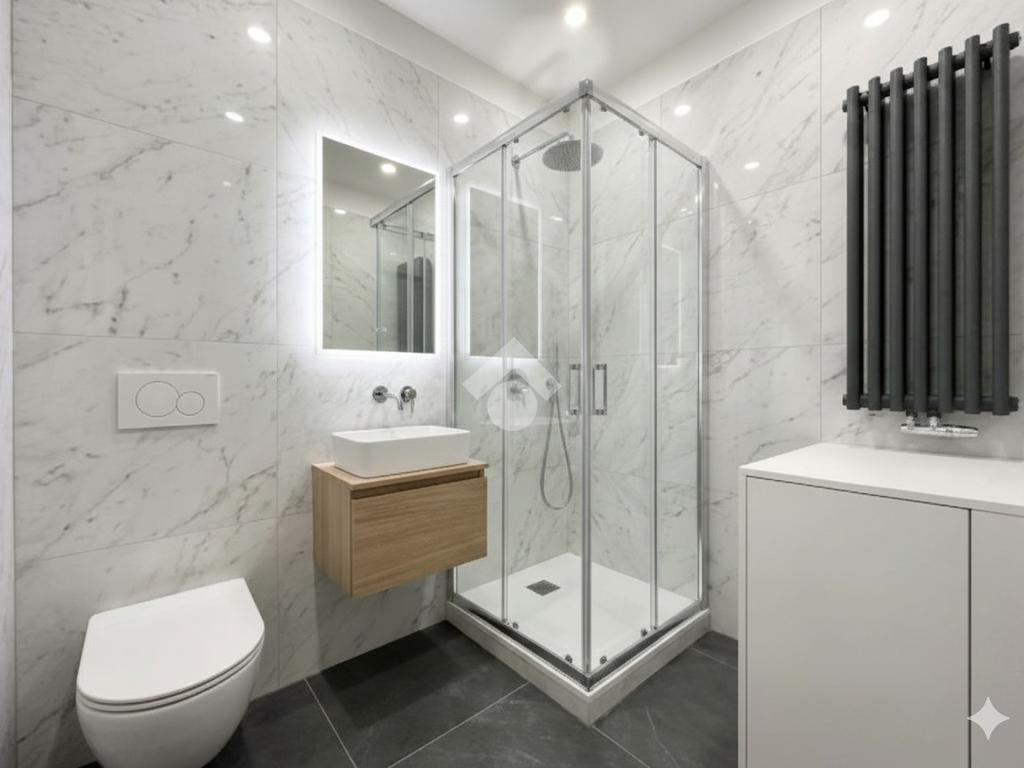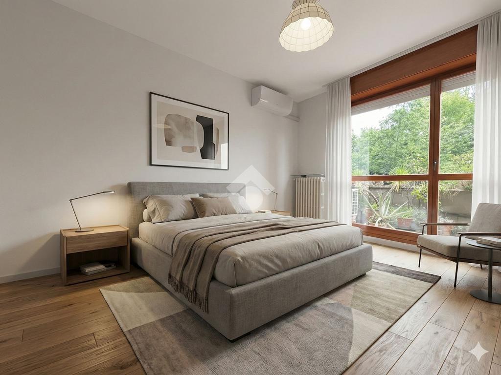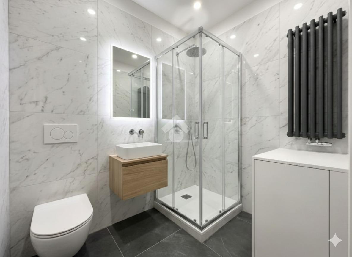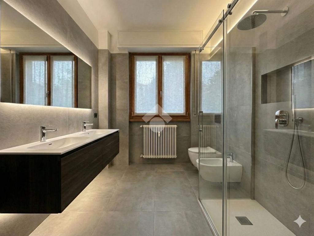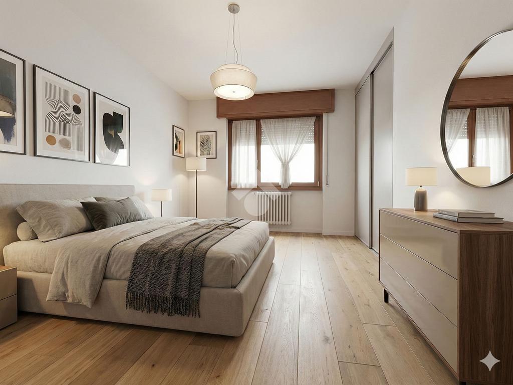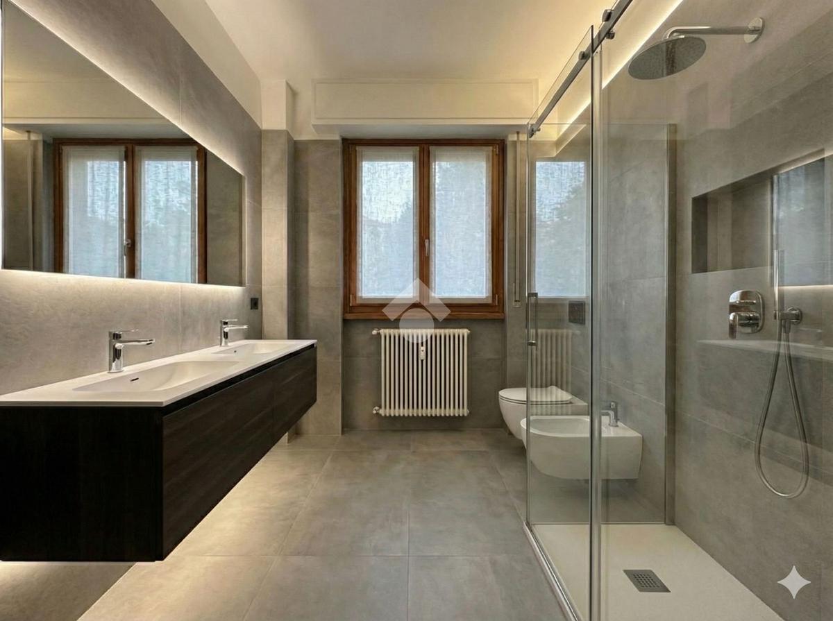 Il disimpegno, dotato di un secondo ripostiglio, conduce alla zona notte suddivisa in tre camere da letto, di cui una matrimoniale, e bagno padronale finestrato atrezzato con doppio lavello, vasca e doccia.