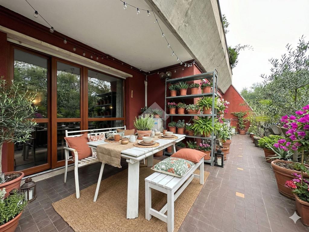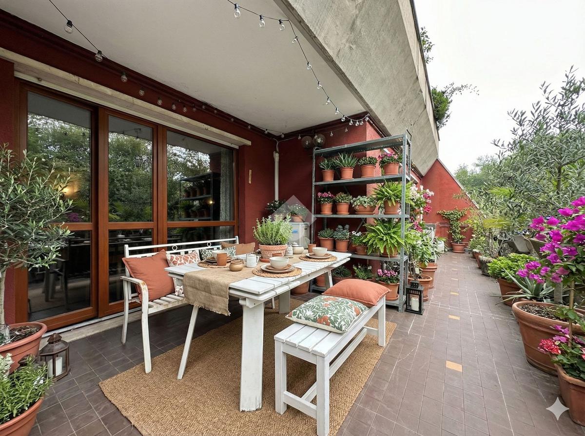 Si accede all'abitazione da uno spazioso ingresso che conduce alla zona giorno, suddivisa in luminoso salotto e cucina abitabile. Entrambi locali vantano di sfogo esterno sull'ampio terrazzo di oltre 40 mq, parzialmente coperto e dotato di scala a chiocciola per l'accesso diretto al giardino privato. Ripostiglio e bagno di servizio completano la zona giorno.